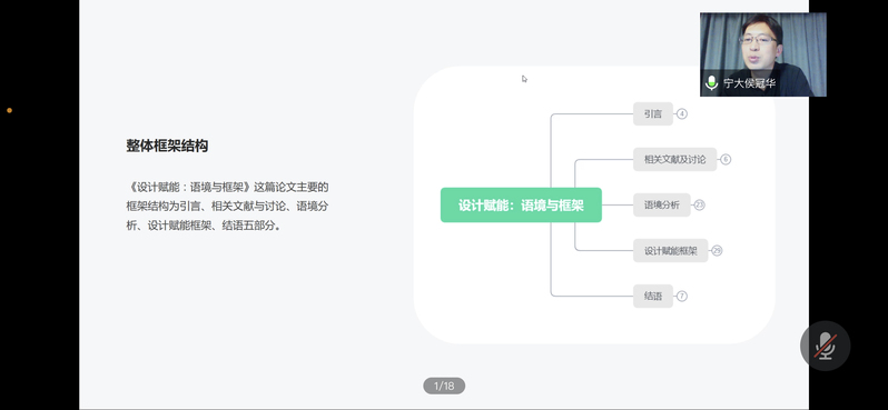 为贯彻落实《关于推动现代职业教育高质量发展的意见》文件精神,进一步激发创意公司教师发展内在动力,潜心研究公司产品,提升教科研能力,2021年11月3日晚,创意公司邀请宁波大学副教授、硕士生导师、同济大学设计学博士侯冠华老师做了《艺术设计研究方法与论文解析》专题讲座,讲座由李方联经理主持,会议采用线上形式进行。