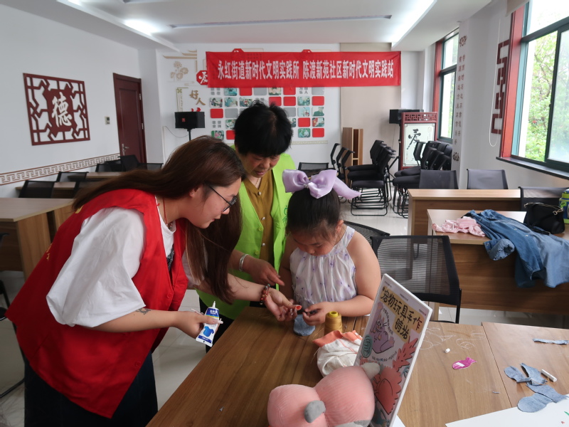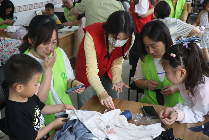 活动以“旧物重生 创意造新”为主题,以“打造人宠双向友好社区”为目标,鼓励社区居民共捐一条牛仔裤,同做宠物玩具。活动中,志愿者化身“创意设计师”,指导大小朋友利用废弃的牛仔裤、纽扣、弹力绳等材料,根据自己设计的玩具形状剪裁、缝合、打扣、粘贴。随着一个个别具一格、天马行空的宠物玩具诞生,孩子们露出了满意的笑容。
