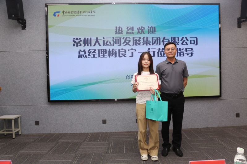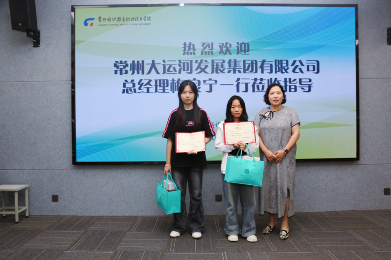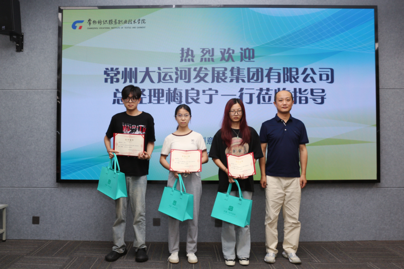 自大赛通知以来,举办方常州大运河发展集团共征集到在常高校员工参赛作品40余份,经过严格初选和终评,公司员工作品获得一等奖1名、二等奖2名、三等奖3名,囊括了比赛的所有奖项。举办方被公司员工独特的创意和精湛的设计深深吸引,特地来公司举行专场颁奖活动。常州大运河发展集团有限公司副总经理兼常州筑鑫建筑设计事务所有限公司总经理梅良宁等一行,于7月2号来到公司为获奖员工举行了隆重的颁奖仪式。仪式结束后,集团领导一行还参观了8号楼和7号楼教学实训场所及教师工作室,对公司浓厚的艺术氛围和独具创意的作品赞不绝口,主动提出未来将进一步加强校企合作,推进产教融合。