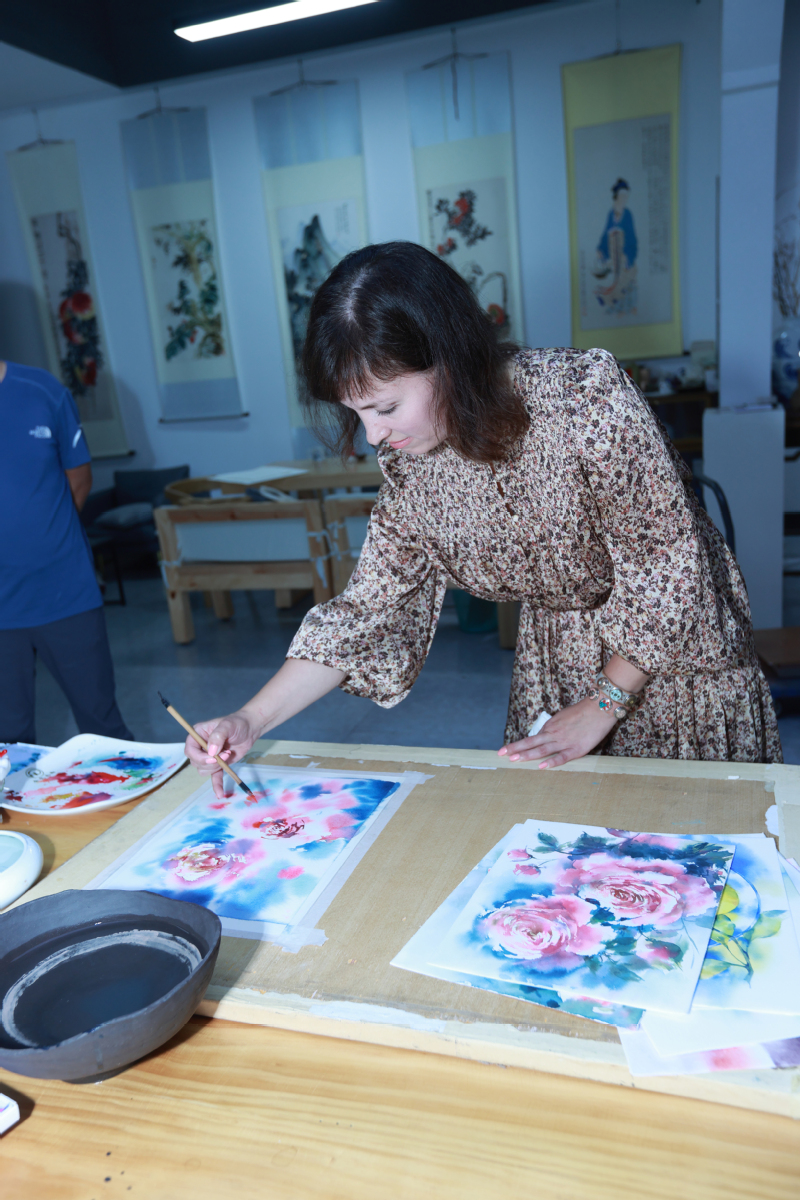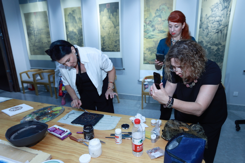8日下午,俄罗斯艺术考察团一行参观公司文化传承与创新中心,并与在常高校艺术教师代表开展了学术交流和艺术创作。在参观交流中,俄罗斯一行对中国传统文化表现出浓厚的兴趣和喜爱。在艺术创作中,双方代表展示了对油画、水彩、中国画不同表达,并互赠作品留念。