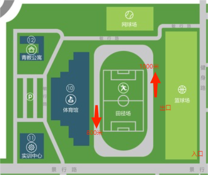 第二单元项目测试由体育部统一组织,路线平面图如下: