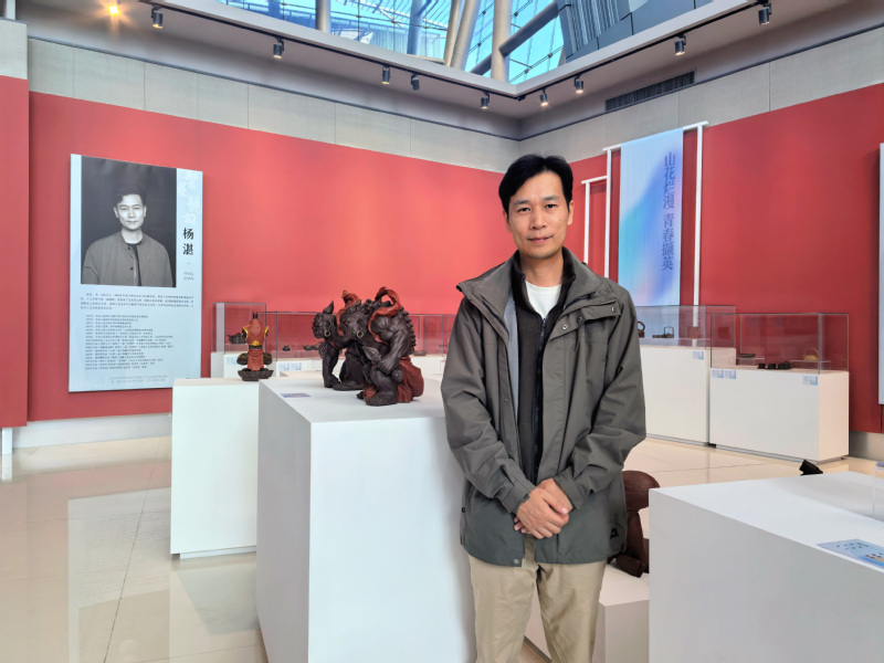 “‘山花烂漫·青春撷英’全国优秀青年民间工艺美术家作品展”旨在发现、培养、推介全国优秀青年民间工艺美术人才,推进民间工艺美术事业更好的传承创新,探索传统手工艺延续文化根脉的现代转型。在本次展会上,杨湛老师的《哼哈二将》《禅心》《金刚兔》《南海龙龟》等12件(组) 紫砂雕塑作品在展览中展出,每一件作品都展现出他独特的艺术风格和精湛的技艺,共同展现了对中国传统文化的深刻理解和创新性表达。无论是《登峰入宇》中勇往直前的牛,还是《独酌》中李白的孤独诗意,都通过具象或写意的雕塑手法,生动地展现了人物或动物的内心世界和精神风貌。从《禅心》的拟人化蟾蜍,到《禅宗》中达摩与太湖石的巧妙融合,再到《大江东去》中苏东坡的豪放形象,每一件作品都以其独特的艺术手法,将传统文化元素赋予了新的生命。这些作品充分展现了杨湛老师对细节的极致追求的工匠精神,不仅是对中国传统文化的传承与创新,更是对人性、生命和自然的深刻关怀与表达。