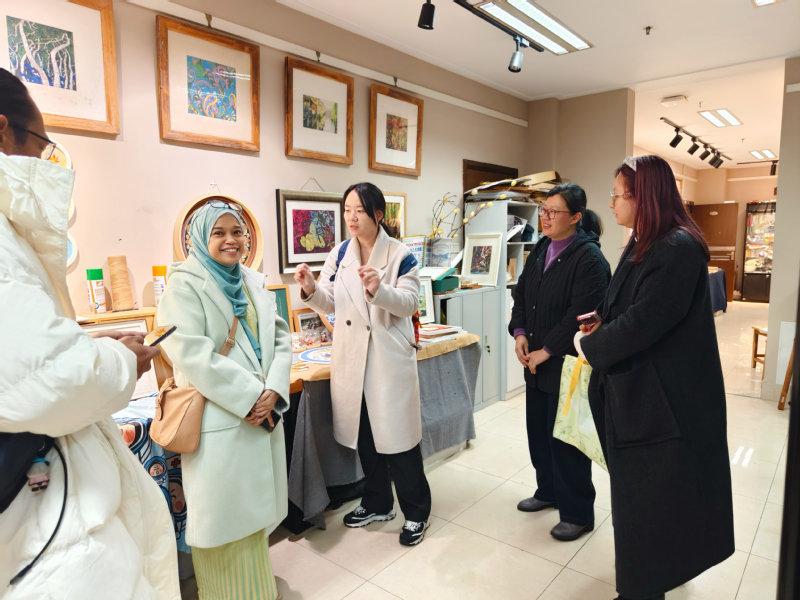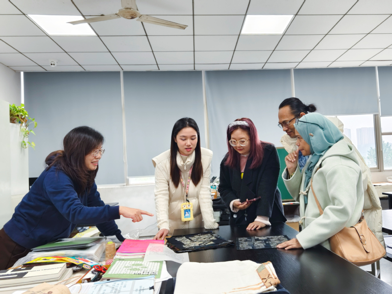 之后,Hanisa博士一行参观了4号楼纺织科技文化馆、7号楼文化传承与创新中心、8号楼蓝鲸体育和服装与时尚设计公司教学实训场所。Hanisa博士是马来西亚纺织技术与服装设计方面的专家,对公司纺织技术与服装设计方面深厚的积淀,校园浓厚的艺术氛围,教师工作室丰富多彩的创新作品连连发出称赞,并表示要加快推动马来西亚员工来公司现场学习交流。