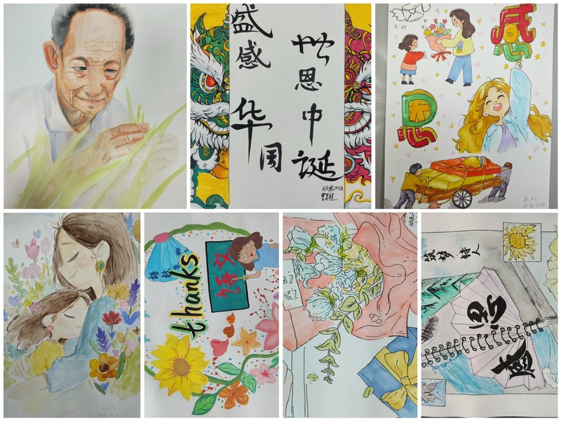 创意学子充分发挥特长,用绚丽的色彩和细腻的笔触抒发着内心的感恩之情与爱的力量,作品题材丰富多样,有的描绘了温馨的家庭场景,父母与孩子之间的深情互动令人动容;有的展现了大自然的美丽与恩赐,表达对地球母亲的感恩;还有的通过生动的人物形象,讲述着一个个关于爱与奉献的故事。这些作品提醒我们要时刻心怀感恩,珍惜身边的人和事,用爱传递温暖。